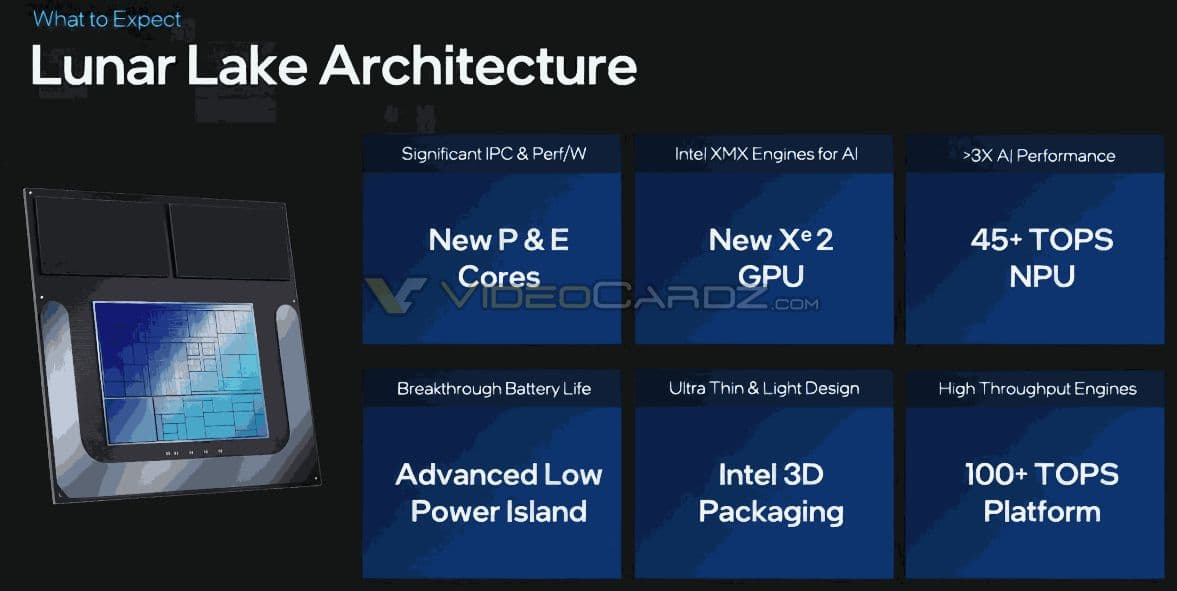 Процессоры Lunar Lake-MX ориентированы на мобильные ПК, причём не самые мощные. Это процессоры, которые с самого начала разрабатывались с прицелом на максимальную энергоэффективность, поэтому внутри всего четыре больших и четыре малых ядра. Зато Lunar Lake получат очень производительный iGPU на новой архитектуре Battlemage и мощный блок NPU с производительностью 45 TOPS. Суммарная производительность процессора в задачах ИИ оценивается в 100 TOPS, что выше, чем у новейших Snapdragon X.