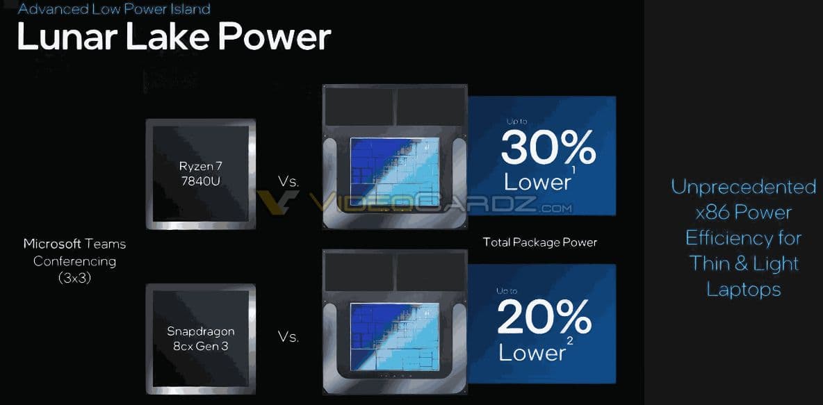 К слову, в рекламных материалах, которые попали в Сеть, Intel сравнивает Lunar Lake именно с новой платформой Qualcomm, что довольно необычно. Конечно, Intel обещает существенное преимущество своих CPU.