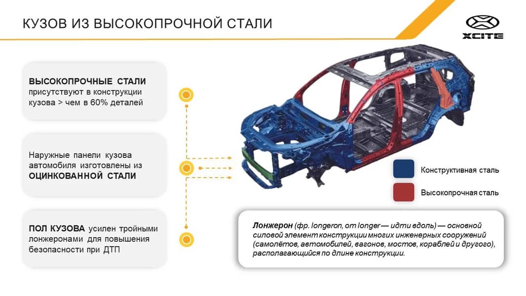 Кузов автомобиля XCITE X-Cross 7 — Chery Tiggo 7 Pro, сборку которого наладили на бывшем российском заводе Nissan — на 60% состоит из высокопрочных сталей. Об этом рассказал производитель машины — «Автозавод Санкт-Петербург» (бывший российский завод Nissan).