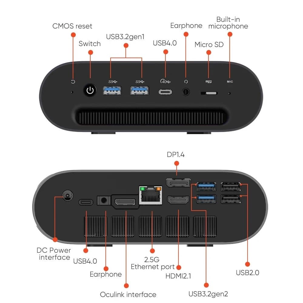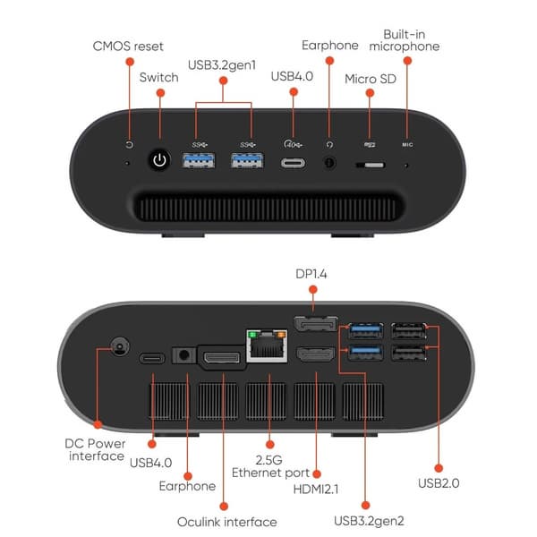 Компьютер комплектуется 8-ядерным Ryzen 7 8845HS. Есть адаптеры Wi-Fi 6, Bluetooth 5.2 и Gigabit Ethernet 2,5 Гбит/с. Также в наличии по два порта USB 3.2 Gen 2, USB 3.2 Gen 1 и USB 2.0. Видеовыходов тоже два: DisplayPort 1.4 и HDMI 2.1.