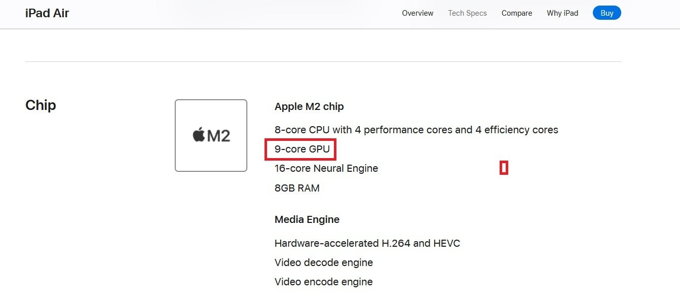 Во время анонса было объявлено, что SoC M2 получила 10-ядерный GPU. Однако теперь на официальном сайте Apple указана иная информация. Производитель попросту изменил страницу технических характеристик iPad Air (2024) в разделе, посвященном чипу M2.