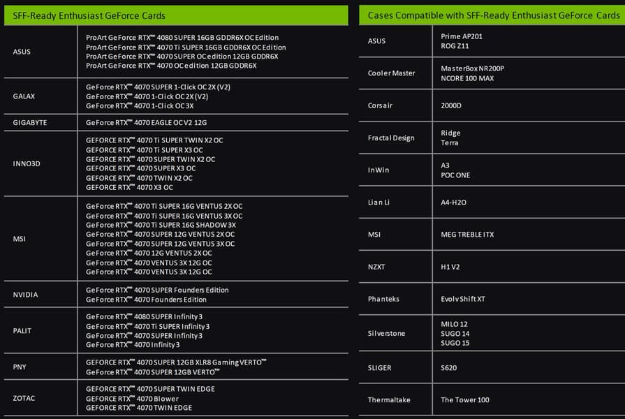 Это далеко не мало, особенно учитывая, что такую карту нужно уместить в очень компактный корпус. Но эта инициатива, напомним, нацелена и на корпуса, то есть они должны оставаться компактными, но при этом вмещать довольно длинные 3D-карты. Собственно, список совместимых корпусов уже имеется, но их число, конечно, будет расти.