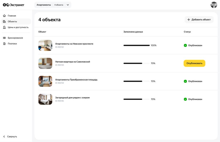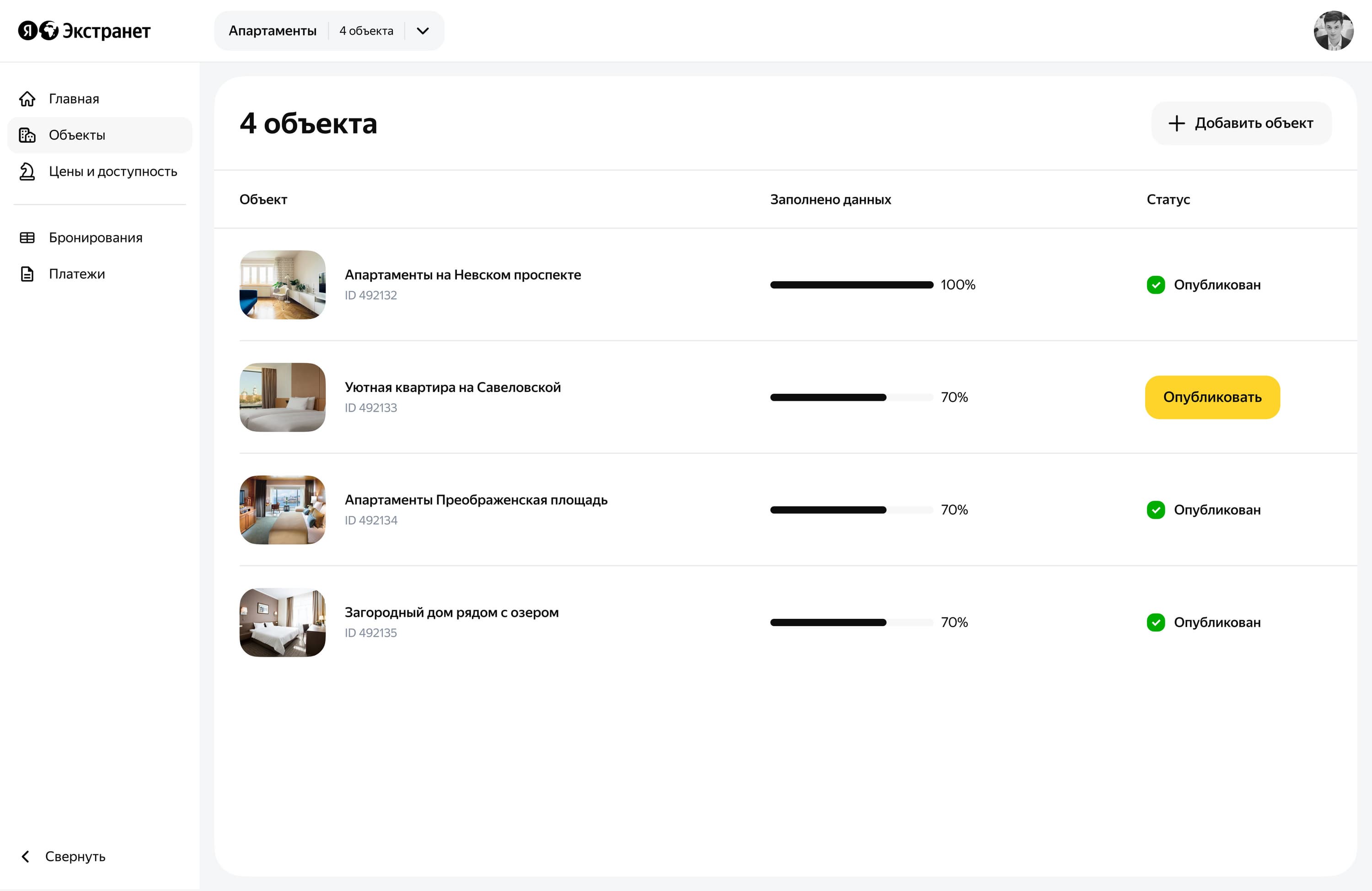 Чтобы разместить объект, достаточно указать адрес электронной почты и менеджер каналов — после этого данные о жилье поступят в «Экстранет» «Яндекс Путешествий». Далее, если потребуется, владелец дополняет информацию о своём предложении и публикует его. После модерации объявление появится на «Яндекс Путешествиях».