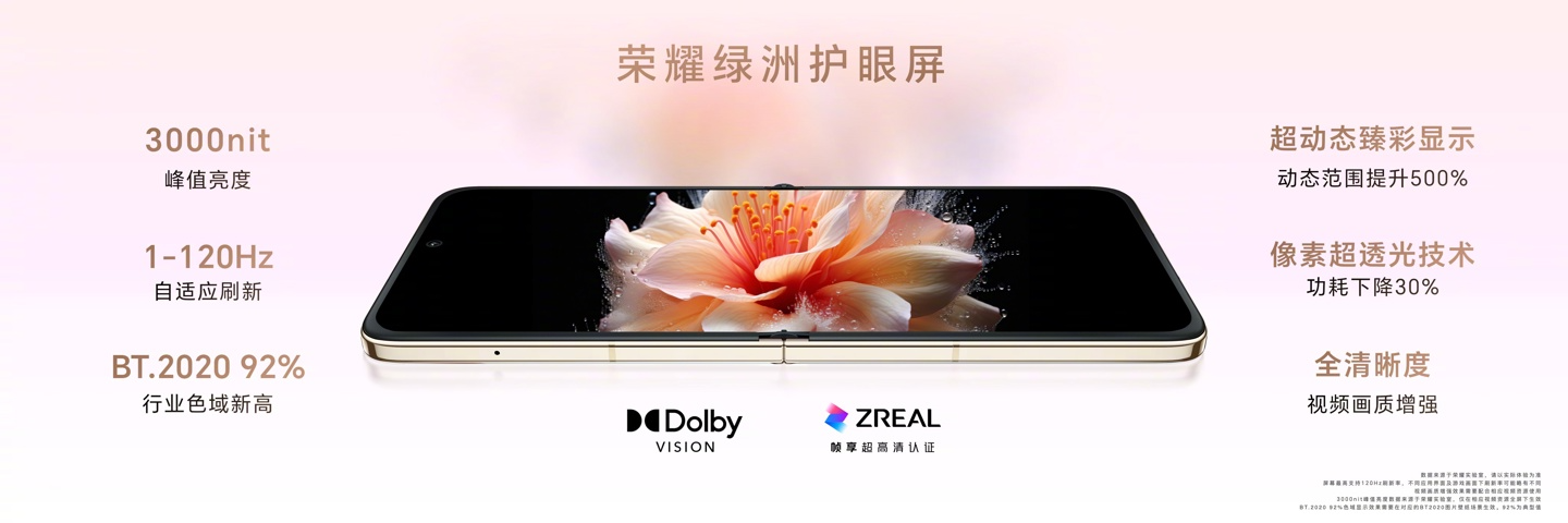 Внутренний экран Honor Magic V Flip получил диагональ 6,8 дюйма, разрешение 1,5K (2520 х 1080 пикселей) и кадровую частоту обновления 120 Гц. Устройство оснащено стереодинамиками.