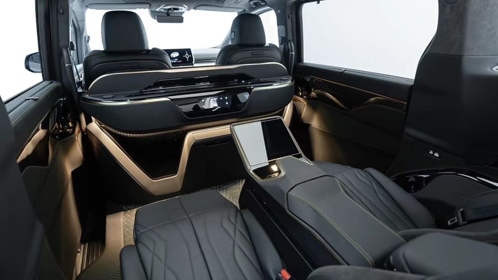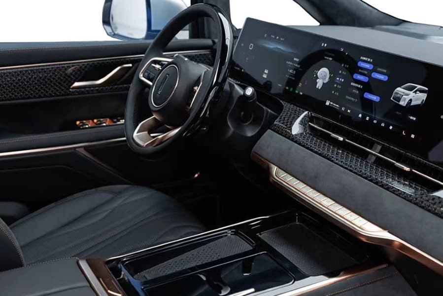 У Wey 80 Co-Creation черная отделка салона с декоративными элементами, окрашенными в золотой, четыре кресла с кожей Nappa, акустическая система Harman-Kardon с 20 динамиками и интегрированный в климатическую систему ароматизатор с тремя уникальными ароматами.