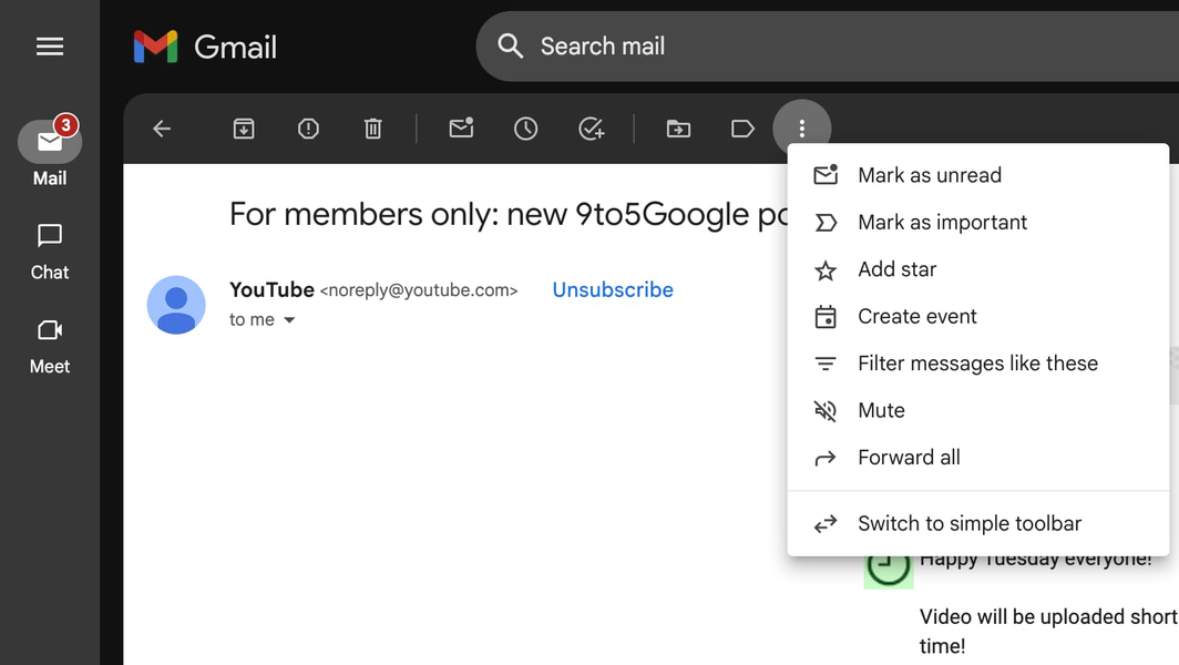 При просмотре почты на простой панели инструментов отображаются только следующие пункты: «Архивировать», «Сообщить о спаме», «Удалить», «Отметить как непрочитанное» и «Переместить в». Все остальные пункты можно найти в дополнительном меню.