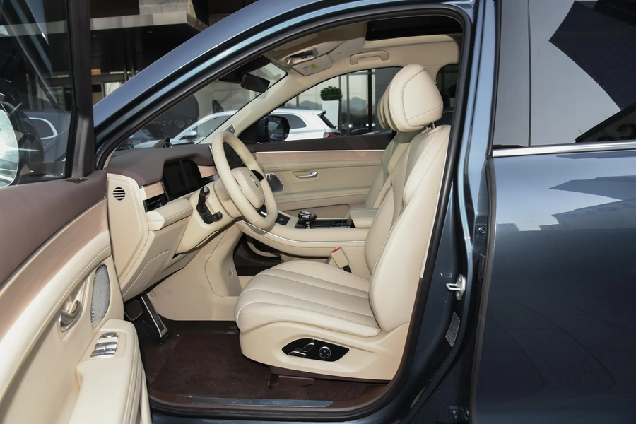 Aito M7 Ultra доступен в 5- и 6-местном вариантах с размерами 5020 х 1945 х 1760 мм и колесной базой 2820 мм. В салоне расположены 10,25-дюймовая полностью ЖК-панель приборов и 15,6-дюймовый центральный экран управления с разрешением 2K. Стандартные цвета салона — абрикосовый и коричневый, также доступен опциональный оранжевый цвет. Кроме того, сиденья были отделаны кожей Nappa.