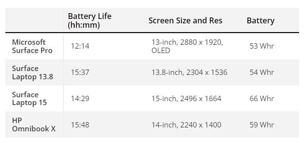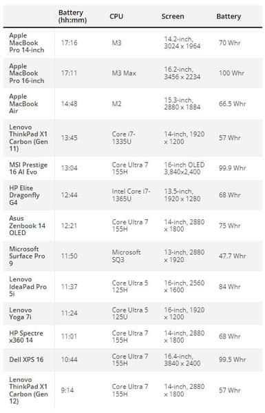 Ну и, конечно, лидерами рейтинга все еще являются MacBook Pro. Они, правда, как раз выделяются весьма крупными батареями, но между Surface Laptop 15 и MacBook Pro 14 на M3 разница в емкости не так велика, как разница в автономности. Впрочем, во-первых, MacBook Air на M2 обходит уже не все новинки на Snapdragon X Elite, а во-вторых, MacBook Pro лучше новинок не особо существенно.