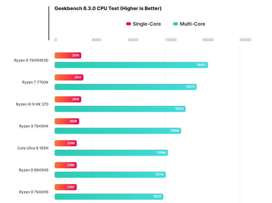 Одноядерная производительность новинки заметно выросла относительно прошлого поколения Ryzen из этой же категории. В частности, новый APU быстрее Ryzen 9 8945HS примерно на 20% в обоих режимах. Более того, новинка даже быстрее, чем высокопроизводительный Ryzen 9 7845HX с его 12 ядрами и TDP до 75 Вт. Напомним, у Ryzen AI 9 HX 370 тоже 12 ядер, но восемь из них представляют собой ядра Zen 5c, работающие на пониженной частоте.