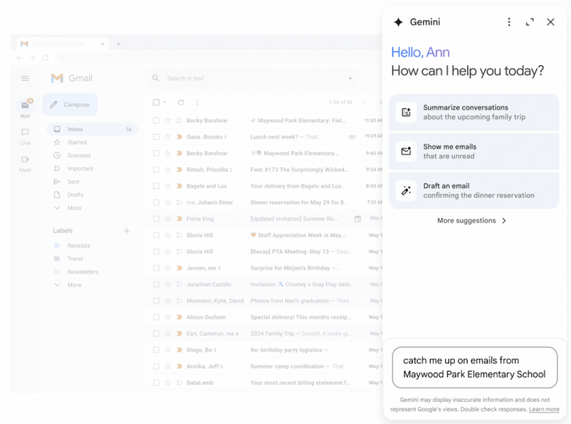 Gemini в Gmail может кратко изложить суть переписки, предложить ответы для цепочки писем, подсказать при составлении электронного письма, помочь с быстрым поиском информации в письмах в вашем почтовом ящике или в файлах «Google Диска». Gemini можно использовать и в мобильном приложении Gmail на Android и iOS – для анализа цепочек писем и просмотра обобщенного изложения с ключевыми моментами.