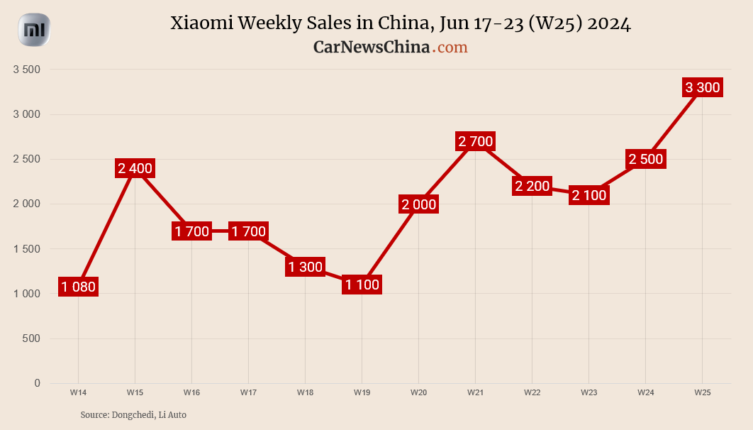 На 25-й неделе года (17–23 июня) рынок электромобилей Китая уверенно рос, при этом продажи Tesla увеличилась на 50%, BYD — на 17%, а продажи Xiaomi — более чем на 30%. Впервые с момента начала продаж Xiaomi попала в топ-10 лучших на китайском рынке.