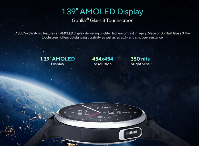 Asus VivoWatch 6 оснащены круглым экраном AMOLED с диаметром 1,39 дюйма и разрешением 454 х 454 пикселя. Защиту обеспечивает закаленное стекло Corning Gorilla Glass 3. Заявленная автономность в обычном режиме работы — до 9 дней. Есть водозащита (5ATM), GPS.