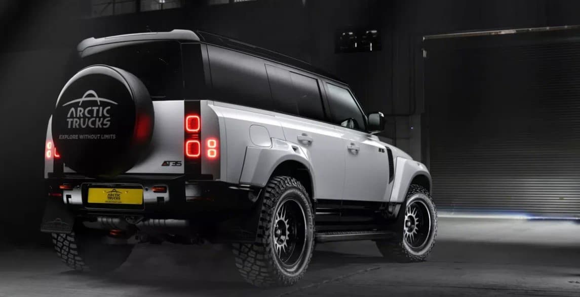 Новые колёса прикрыты расширителями колёсных арок. Кроме того, разработаны оригинальные бамперы, пороги и дополнительная светотехника. Defender украсили шильдиками с названием версии. Специалисты Arctic Trucks могут изменить оформление салона за доплату.