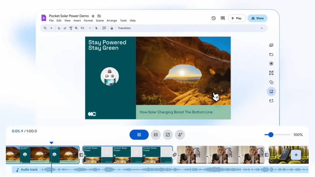 Google Vids может сгенерировать видеоролик на основе текстового запроса. Получив текстовую подсказку, Google Vids предоставит пользователю базовую раскадровку для работы, которую можно настроить, уточнить, выбрать определенный стиль для видео. И даже включить документы или файлы непосредственно из своей учетной записи Google Drive. К ролику можно добавить собственный голос или голос по умолчанию.