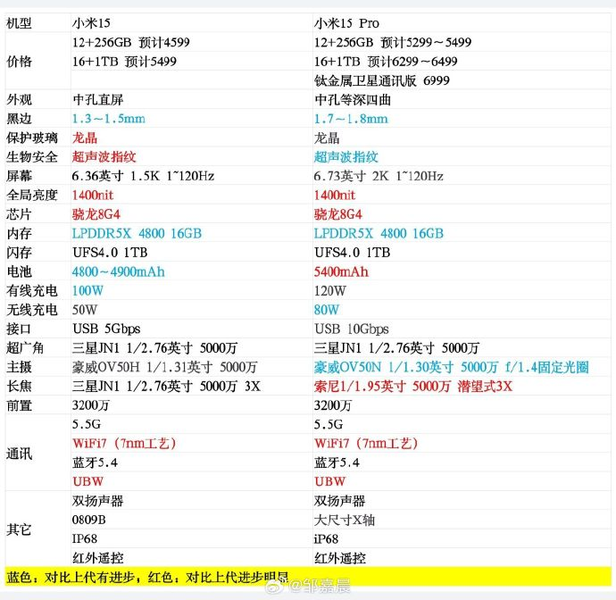 Табличка со всеми характеристиками будущих смартфонов Xiaomi 15 и Xiaomi 15 Pro просочилась в Сеть задолго до анонса.