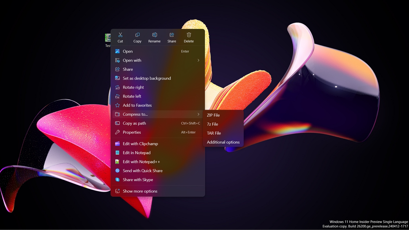 Среди основных улучшений – возвращение кнопки «Показать рабочий стол», которая была скрыта по умолчанию, когда Microsoft выпустила Copilot для всех пользователей. ОС теперь также позволяет создавать файлы 7-Zip и Tape Archive (TAR) с помощью контекстного меню. Щелчок правой кнопкой мыши по файлу и выбор «Сжать в» позволяет использовать такие инструменты, как gzip и bzip2.