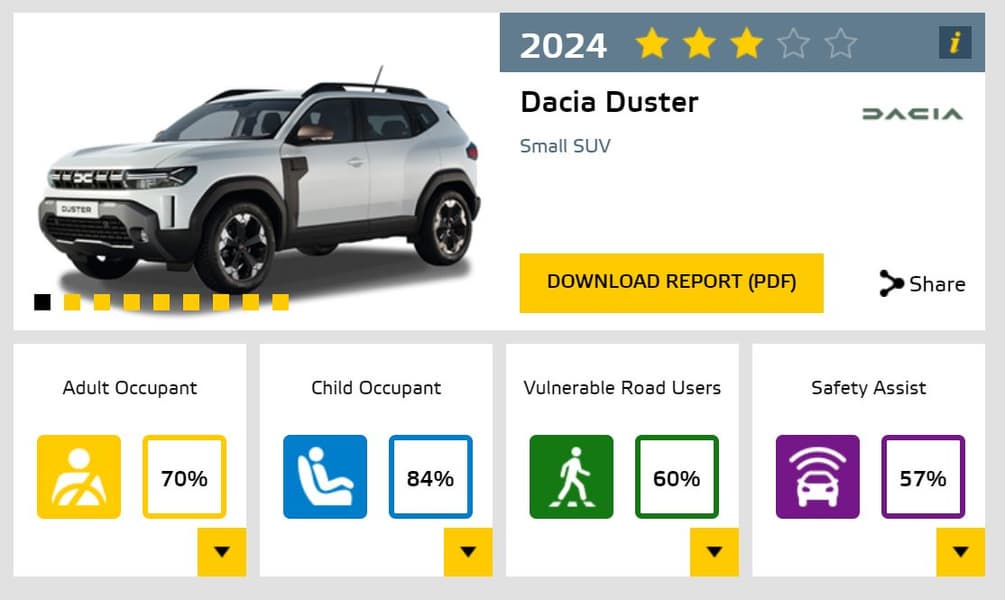 Специалисты Euro NCAP оценили защиту взрослых Duster 2024 на 70%, детей — на 84%, пешеходов — на 60%. За наличие и работу помощников кроссовер набрал 57%. Для сравнения, модель 2017 года (рестайлинг второго поколения) в соответствующих категориях набрала 71%, 66%, 56% и 37% соответственно.