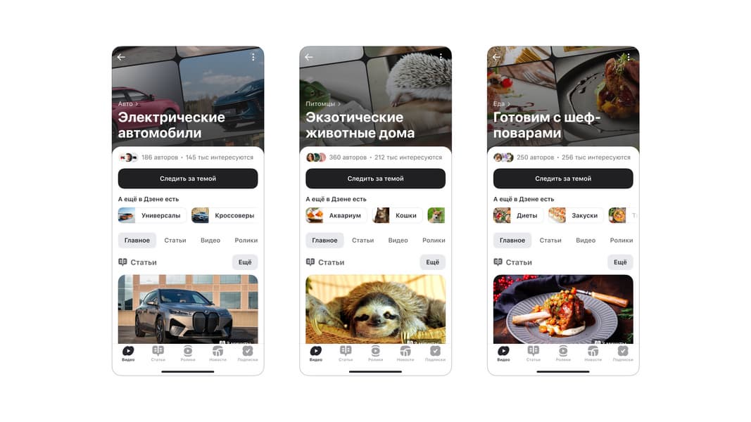 Обновление визуального стиля Дзена — это один из этапов развития платформы. Мы уже структурировали контент авторов по форматам: статьям, видео и роликам, — каждый может выбрать то, что ему интересно, и смотреть контент более вовлеченно. Все разделы теперь связаны общей навигацией, единым принципом формирования карточек и версткой. Дзен стал еще более целостным продуктом, которым приятнее и удобнее пользоваться. Обновленный подход помог и в запуске тематических каналов — в них умные алгоритмы подбирают самый актуальный контент от авторов в разных форматах. Пользователи могут подписываться на них и следить за обновлениями в более чем 500 интересных им нишах. Число тематических каналов будет только расти.
