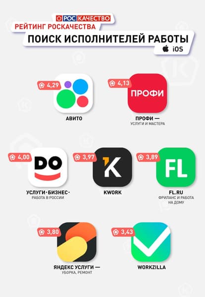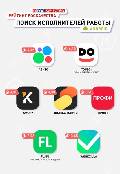 В исследование вошли популярные приложения, которые позволяют искать исполнителей: «Авито», YouDo, Kwork, «Яндекс Услуги», «Профи», Fl.ru, Workzilla.