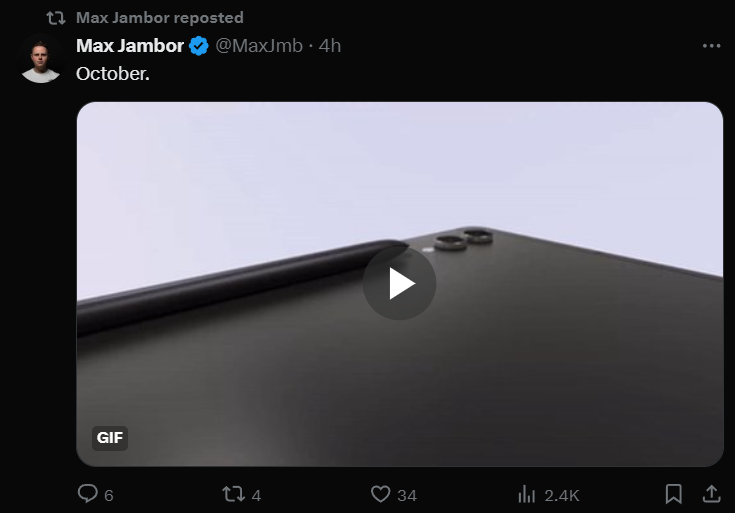 Известный инсайдер Макс Джамбор сообщил в Twitter/X, что серия планшетов Samsung Galaxy Tab S10 выйдет в октябре.
