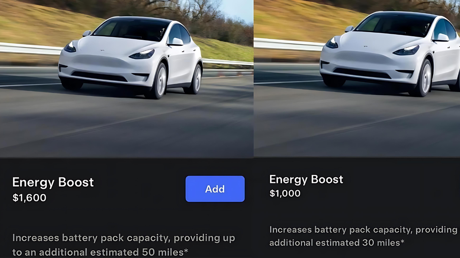 Некоторые владельцы Model Y начали видеть обновление Energy Boost, доступное в приложении Tesla. За 1600 долларов можно увеличить запас хода на 80 км, а за 1000 долларов — на 50 км.