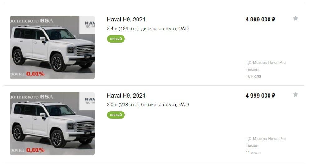«ЦС-Моторс Haval Pro» — официальный дилер Haval из Тюмени — раскрыл стоимость новейшего внедорожника Haval H9 второго поколения. Судя по объявлениям, опубликованным на маркетплейсе Auto.ru, машина будет продаваться за 5 млн рублей. Учитывая, что речь о большом рамном внедорожнике размером с Land Cruiser 300, да еще и с полным приводом, цена (по нынешним меркам) совсем невелика.