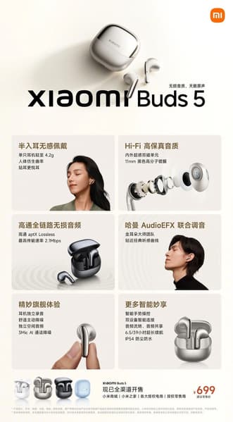 Xiaomi Buds 5 оснащены системой активного шумоподавления, которая в своей работе опирается на три микрофона, также есть поддержка Qualcomm aptX. Над доводкой звучания работали профессионалы из Harman Golden Ear Master Team и AudioEFX.