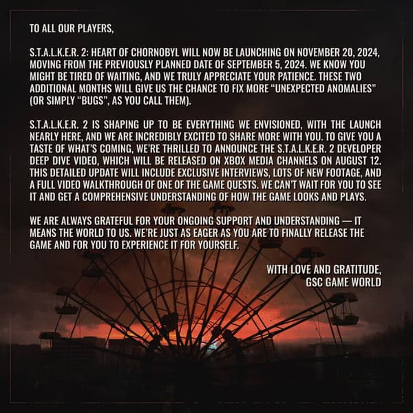 «Мы знаем, что вы, возможно, устали ждать, и мы искренне ценим ваше терпение. Эти два дополнительных месяца дадут нам возможность исправить больше «неожиданных аномалий» (или просто "багов", как вы их называете), — рассказали в GSC Game World.