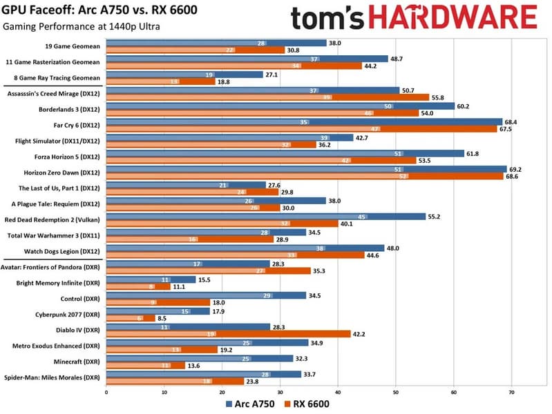 Если говорить об играх без трассировки лучей, Arc A750 в Full HD в среднем быстрее конкурента на величину, которой можно пренебречь. В 1440p разница уже достигает 10%. А если активировать трассировку, то Arc A750 будет быстрее уже на 30%!