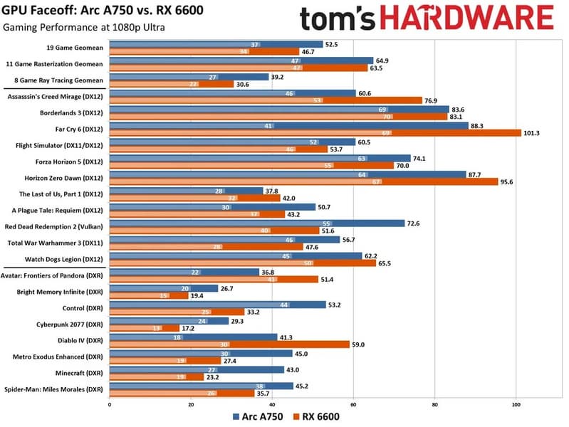 Авторы Tom’s Hardware сравнили RX 6600 и Intel Arc A750, которые сейчас предлагают примерно по одной цене. Оказалось, что адаптер Intel быстрее, то есть, учитывая цены, выгоднее.
