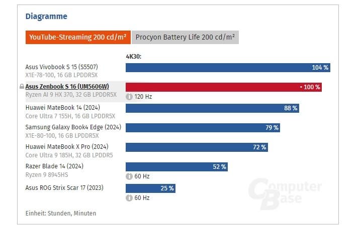Зато 28-ваттный режим позволяет Ryzen AI 9 HX 370 демонстрировать чудеса энергоэффективности. Тестов автономности пока мало, но в режиме просмотра YouTube ноутбук Asus с новым процессором способен конкурировать с лучшими моделями на Snapdragon X Elite, заметно опережая конкурентов на других CPU AMD или процессорах Intel.