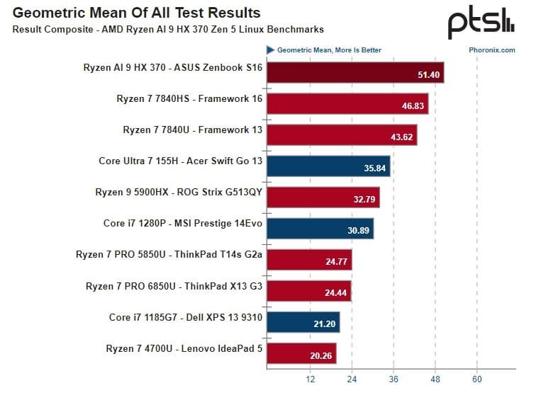 Тут мы можем видеть, что Ryzen AI 9 HX 370 примерно на 10% опережает Ryzen 7 7840HS и на 18% — Ryzen 7 7840U. Учитывая TDP, новинка скорее является преемником именно второго, так как первый часто настроен на 54 Вт и даже более.