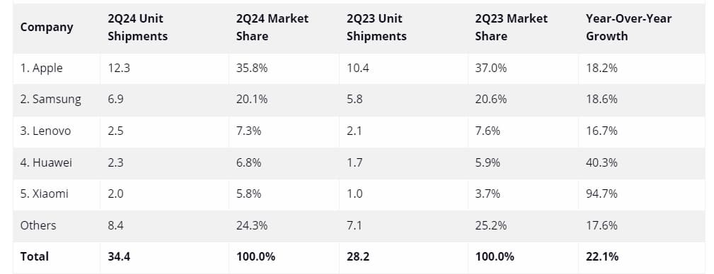 Доля Apple на этом рынке по итогам второго квартала составила 35,8%, что заметно больше, чем у Samsung, которая разместилась на втором месте с долей 20,1%. Тройку лидеров замкнула Lenovo, заняв 7,3%.