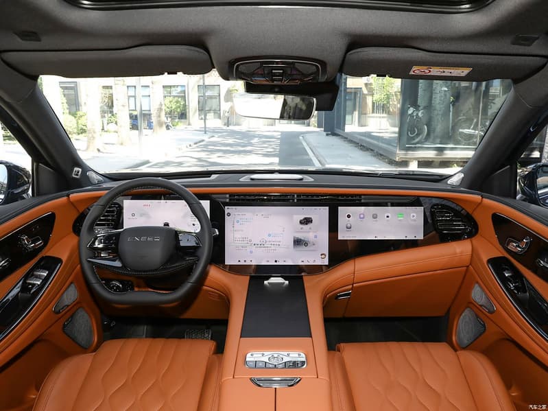 В оснащении машины медиасистема с экраном диагональю 15,6 дюйма, акустическая система с 23 динамиками, атмосферная подсветка, большая панорамная крыша, кожаная обивка кресел и т.д.