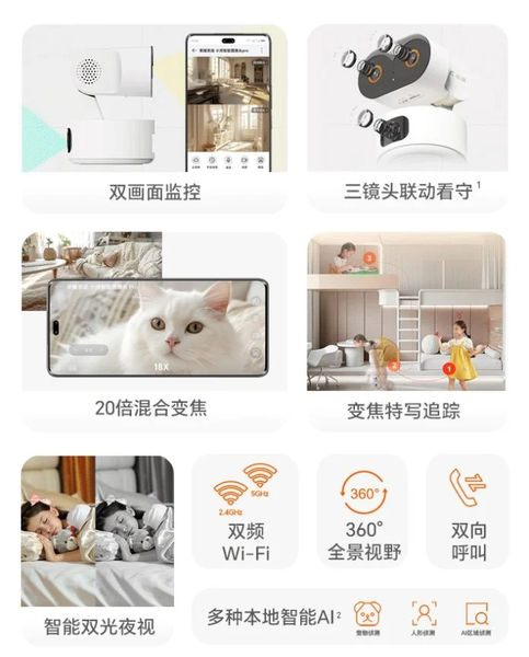 Камера оснащена тройной системой объективов с 4-мегапиксельными датчиками. Отличительной особенностью является возможность 20-кратного суперзума. Кроме того, камера поддерживает мониторинг на двух экранах в режиме реального времени.