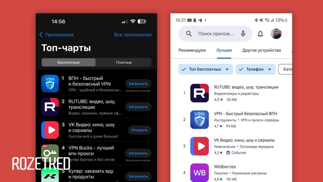 На фоне замедления YouTube в России приложения «VK Видео» и Rutube ворвались в топ Apple App Store и Google Play