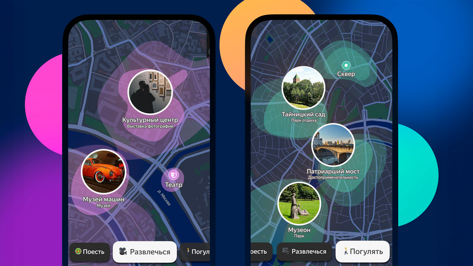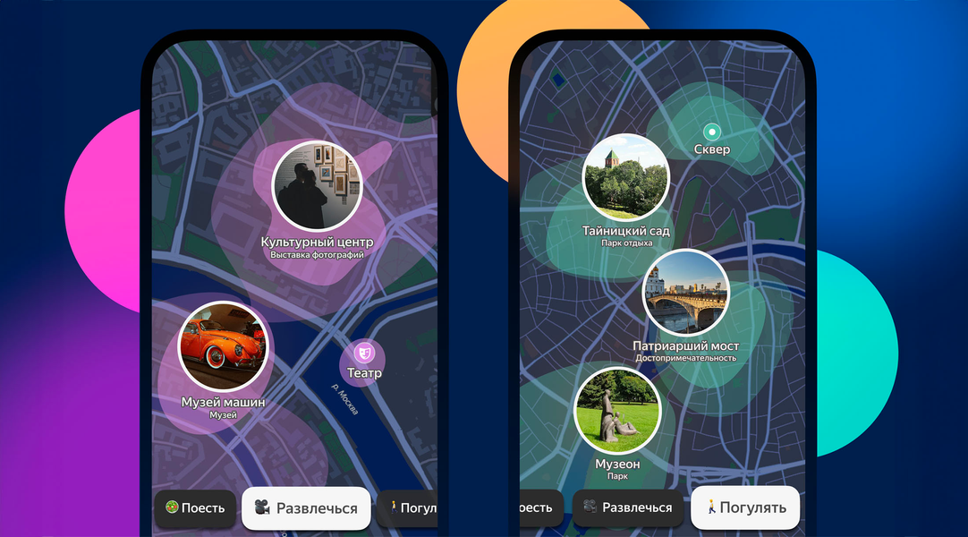 Новые рубрики «Развлечься» и «Погулять» в «Идеях» доступны на главном экране режима «Идеи». При нажатии кнопки «Развлечься» пользователи увидят на карте места с развлечениями, которые могут им понравиться, например концертные залы, аквапарки и клубы. А в рубрике «Погулять» — места, которые интересно исследовать: парки, достопримечательности и смотровые площадки.