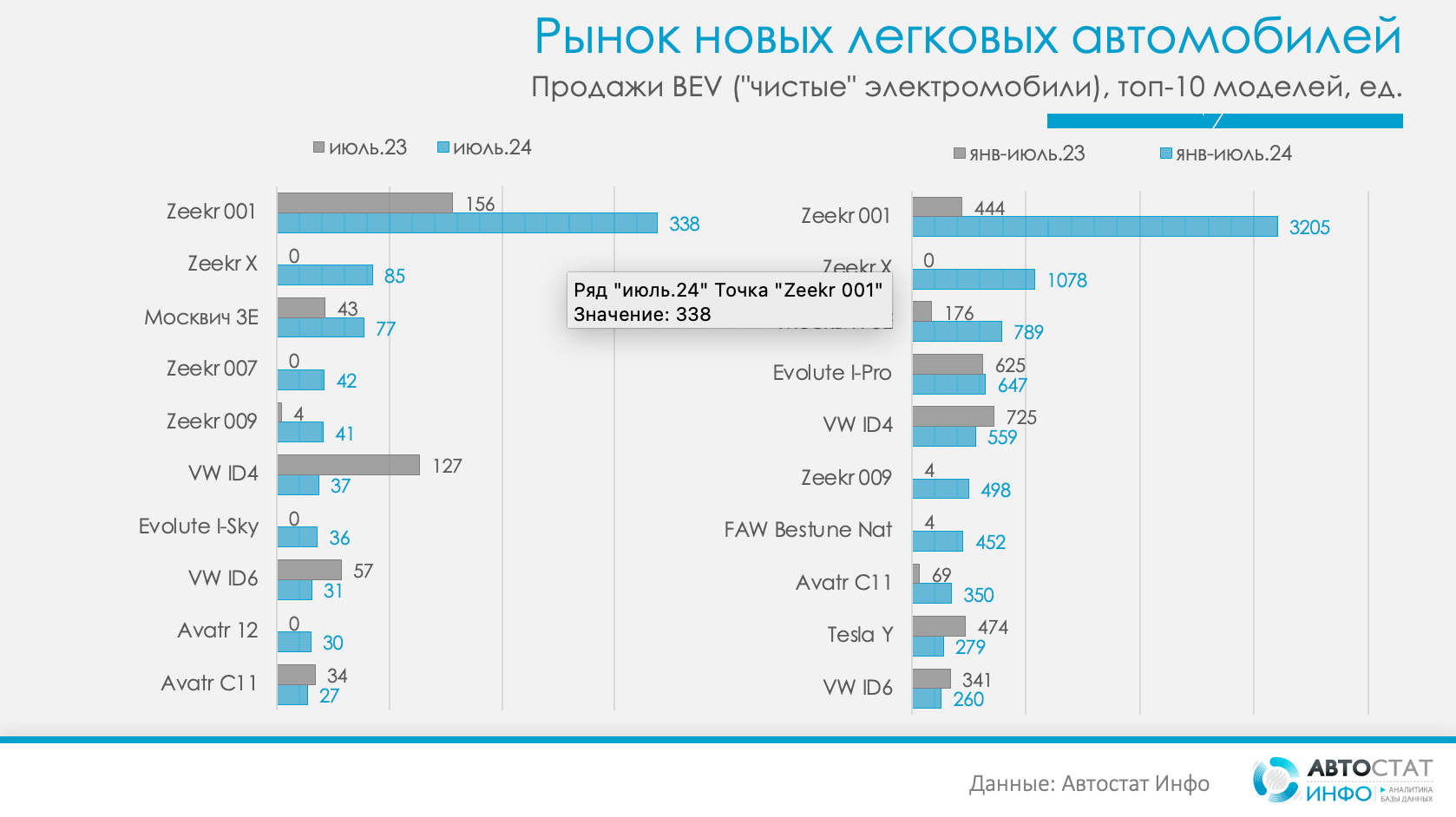 Первое место в модельном рейтинге занимает Zeekr 001 с результатом 338 машин, второе место занимает Zeekr X, продажи которого составили 85 машин. Третье место у «Москвича 3Е» — 77 проданных машин. В пятёрку вошли Zeekr 007 (42 авто) и Zeekr 009 (41 ед.).