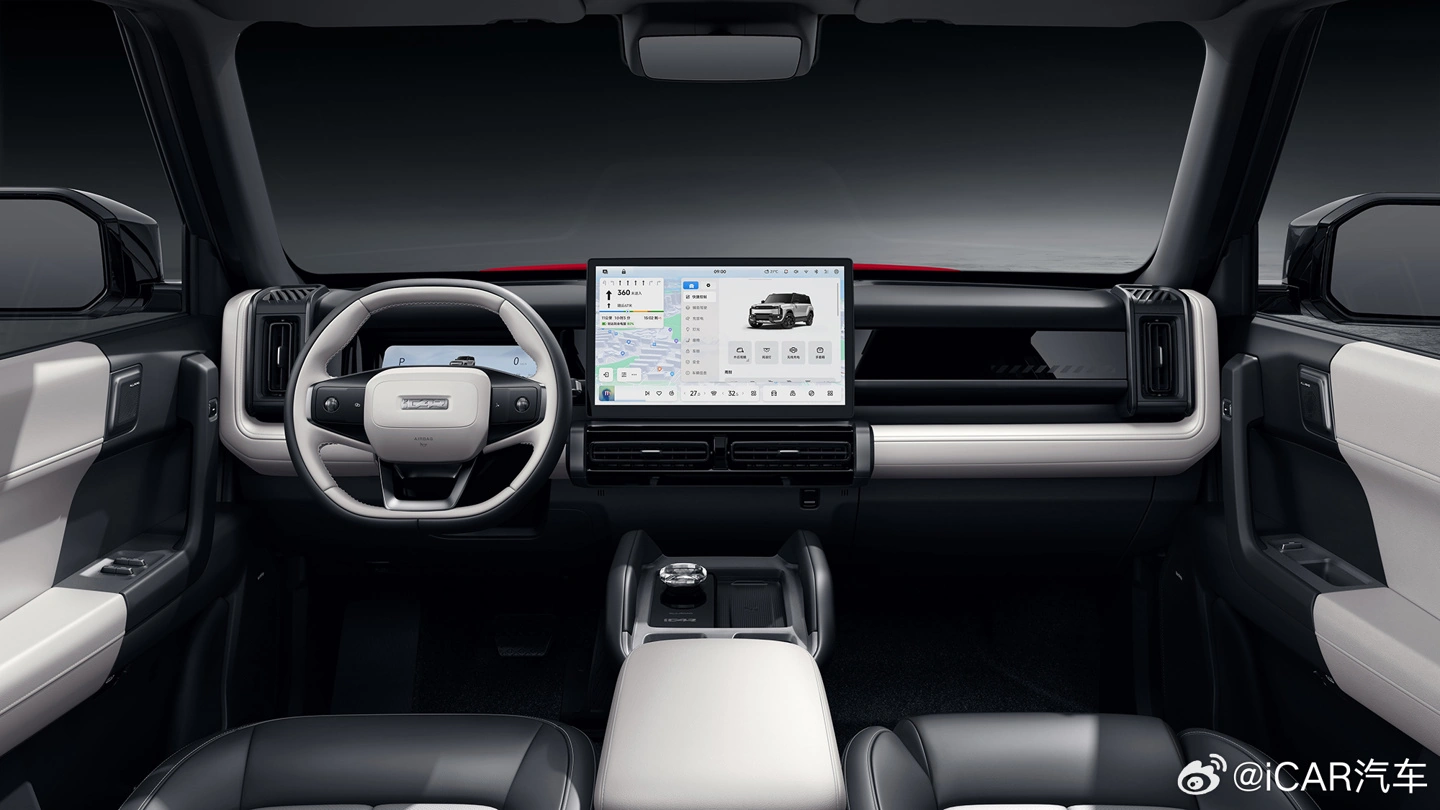 Автомобиль получил рубленый дизайн, а интерьер продолжает компоновку текущего iCar 03. Салон доступен в черно-белом и полностью черном цветах и оснащен ЖК-панелью и большим центральным экраном управления, а также панелью беспроводной зарядки смартфонов.