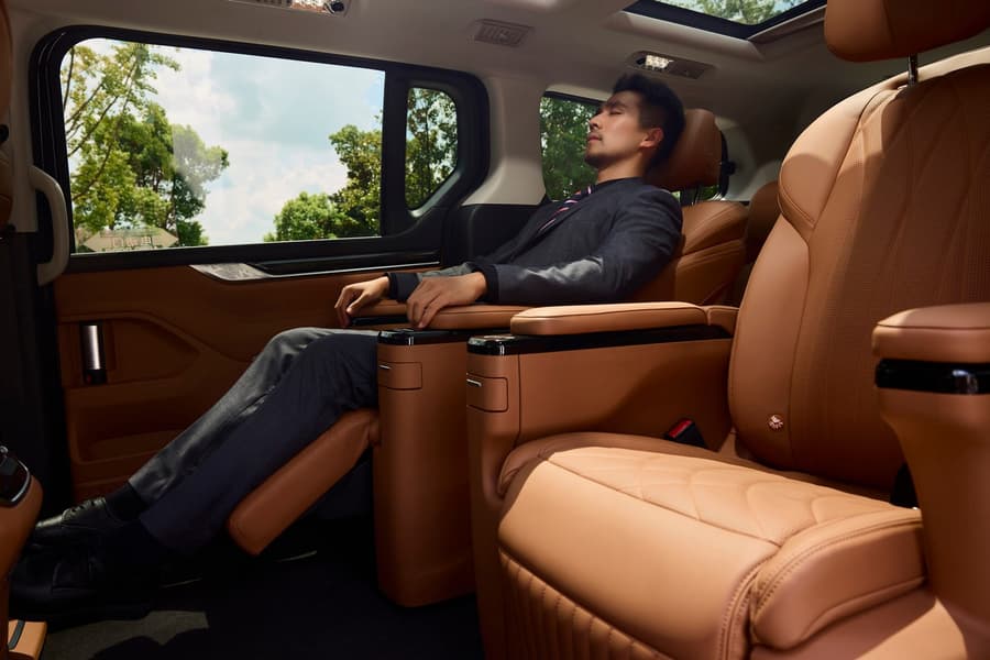 Автомобиль получит безрамочную решетку радиатора с хромированными декоративными элементами. В нее встроены фары со светодиодными ходовыми огнями. Минивэн оснащен пассажирскими креслами с кожаной обивкой, подставками для ног, функцией массажа, подогревом и вентиляцией, а также другими опциями. Производитель сравнивает кресла по комфорту с пассажирскими местами бизнес-класса в авиалайнерах.