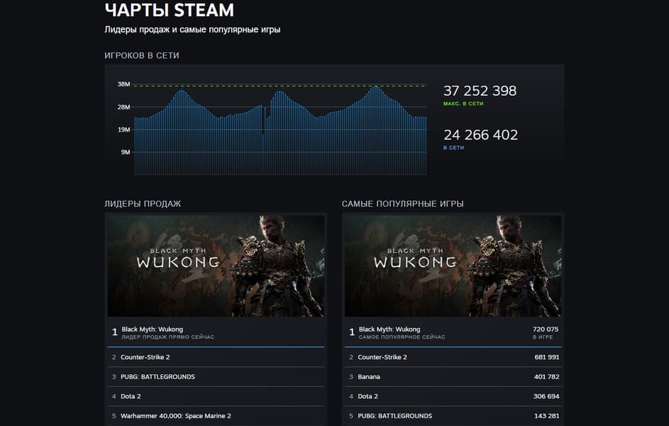 Лидирует по количеству игроков в онлайне и продажам Black Myth: Wukong, следом идёт Counter-Strike 2. Остальные игры в двух чартах показаны на скриншоте.