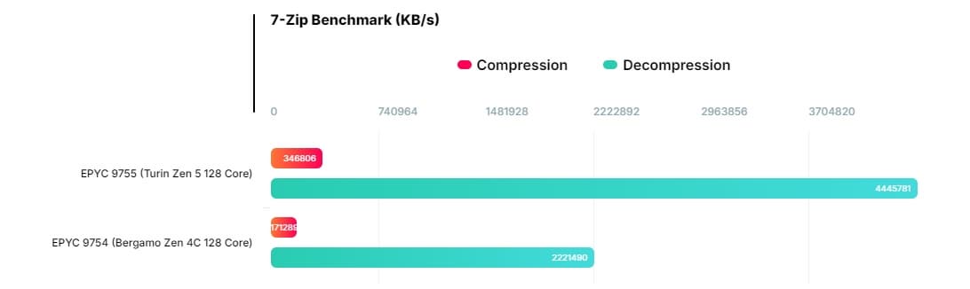 Флагманский 128-ядерный Epyc 9755 поколения Turin как минимум в тестах 7zip на голову превосходит 128-ядерный Epyc 9754 поколения Bergamo. Результаты новинки вдвое выше!