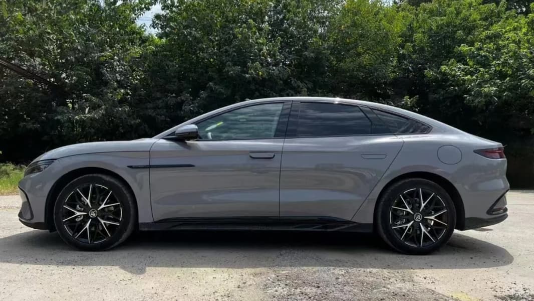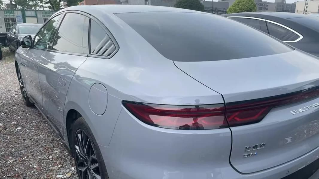 Новый BYD Han DM-i 2025 модельного года окрашен в серый цвет кузова. Он получил выдвижные дверные ручки и черную отделку вместо хрома. Передняя часть Han DM-i имеет радар миллиметрового диапазона. Сзади расположен сплошной задний фонарь и надпись Build Your Dreams.