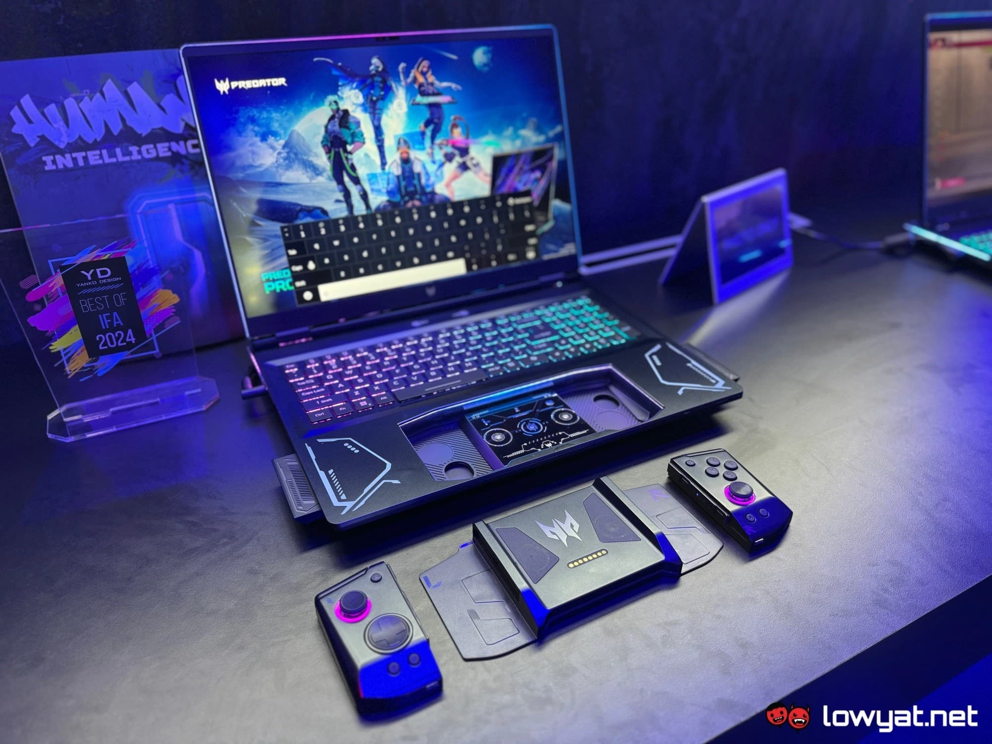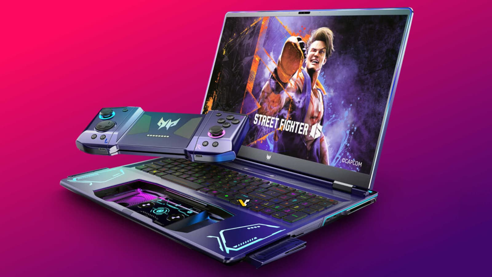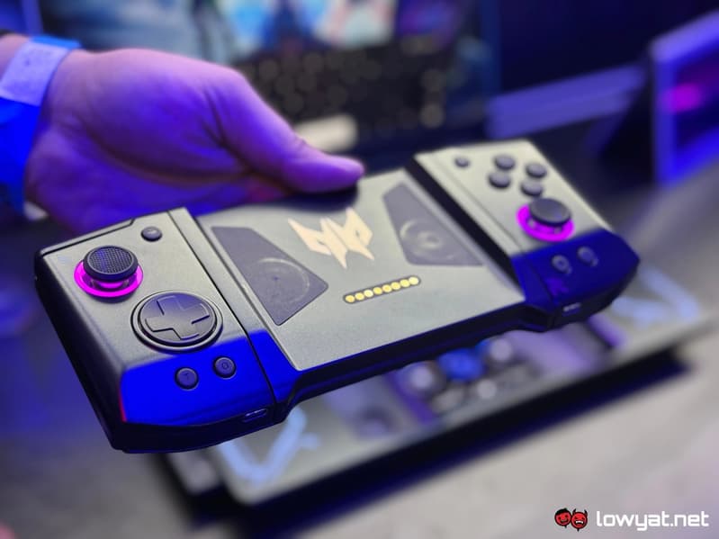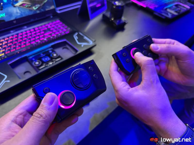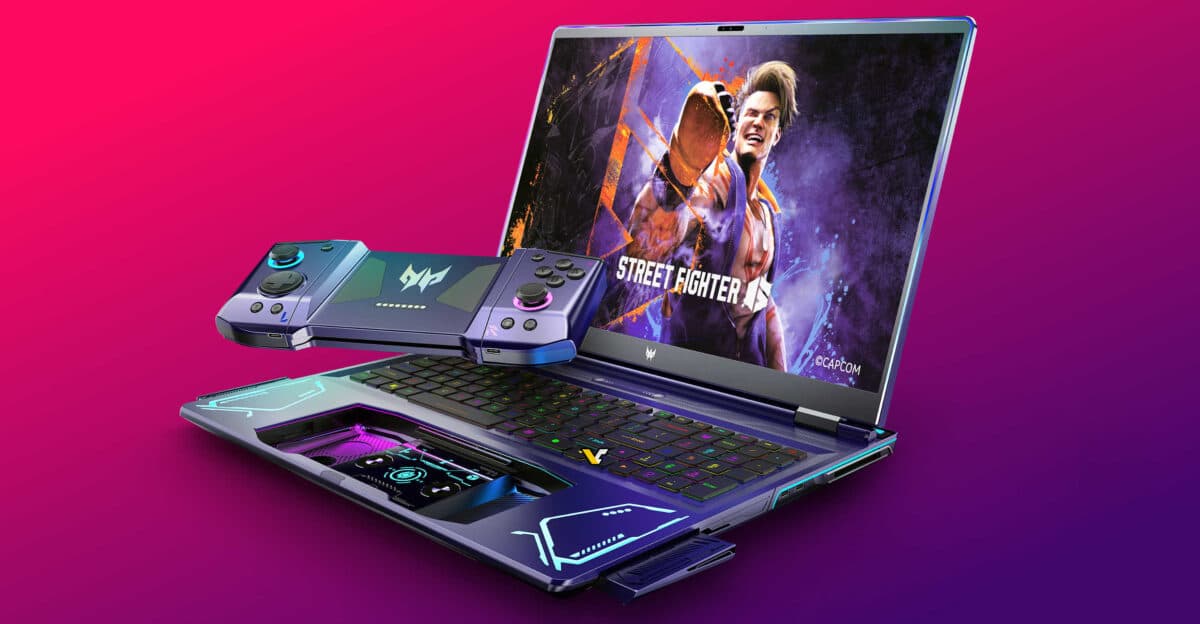 У ноутбука два экрана, но второй реализован достаточно непривычно. Он находится там, где и тачпад, но не совмещён с ним, а расположен под тачпадом. Сам же тачпад — это вообще часть геймпада, который при размещении в ноутбуке выступает именно в роли сенсорной панели, но его можно вытащить и использовать уже как контроллер. Более того, сам этот контроллер ещё и разборной и может превращаться в два контроллера. В целом проще посмотреть видео, чтобы понять, как это всё реализовала Acer.