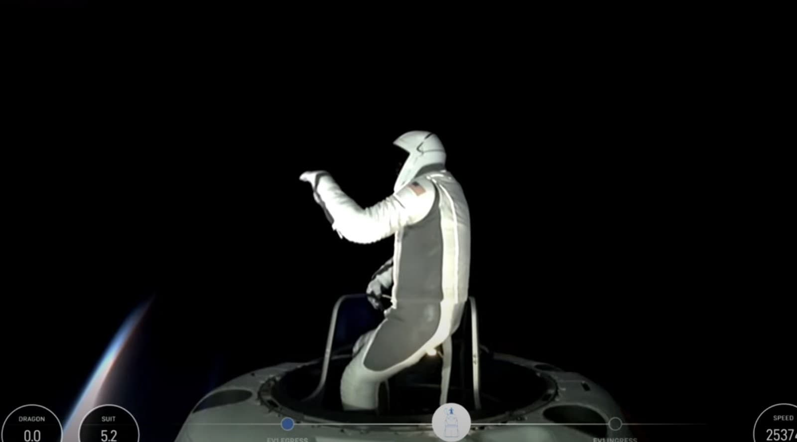 41-летний миллиардер Джаред Айзекман, вышел первым, правда стоит отметить, что он не полностью покинул корабль, как показано ниже.