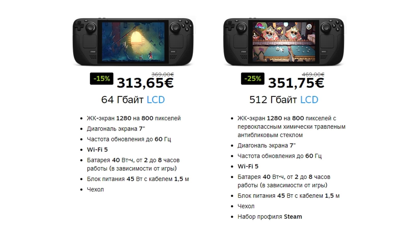 Базовая версия оригинальной Steam Deck с 64 ГБ памяти продаётся всего за 296 долларов в США либо 314 евро в Европе. За консоль с 512 ГБ памяти просят 336 долларов либо 352 евро. В первом случае речь о скидке в 15%, а во втором — в рекордные 25%.