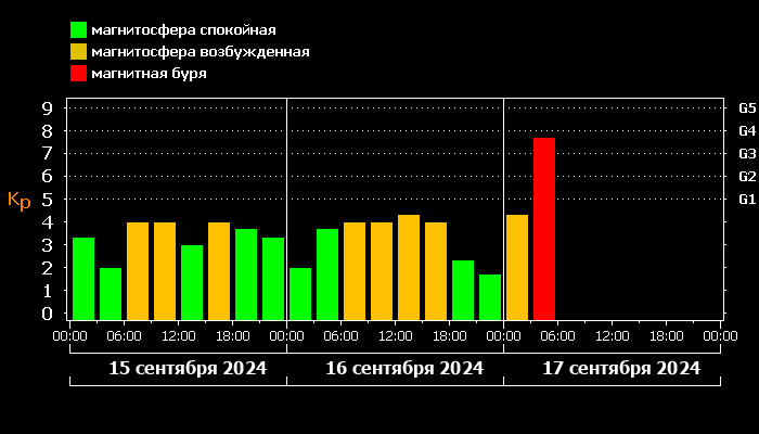 Магнитную бурю 17 сентября 2024 года также прокомментировал ведущий специалист центра погоды «Фобос» Михаил Леус. Он отметил в своём Telegram-канале: