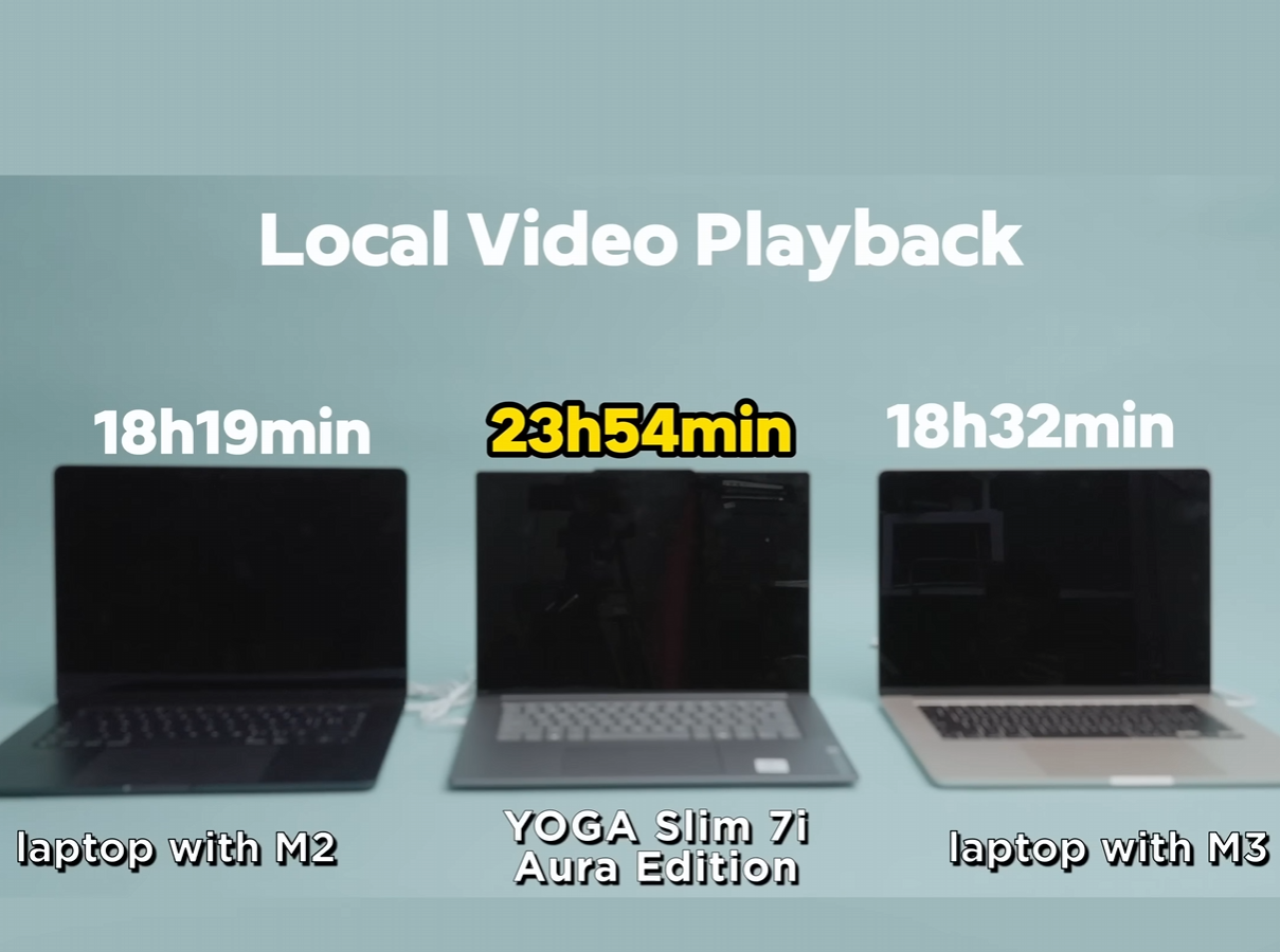 Lenovo опубликовала короткое сравнение нового ноутбука Yoga Slim 7i Aura Edition на основе CPU Core Ultra 7 258V с двумя MacBook: на основе SoC M2 и M3.