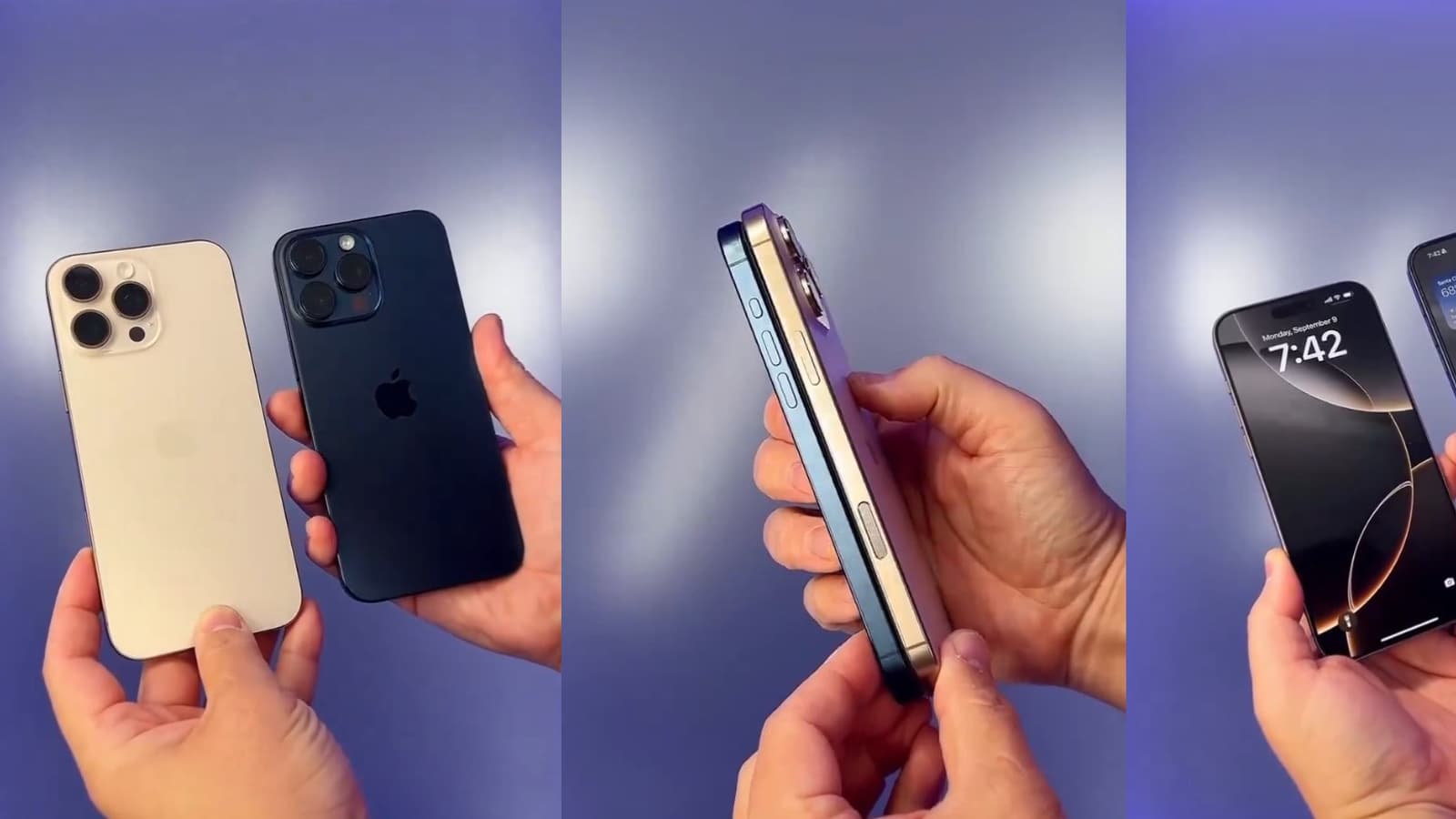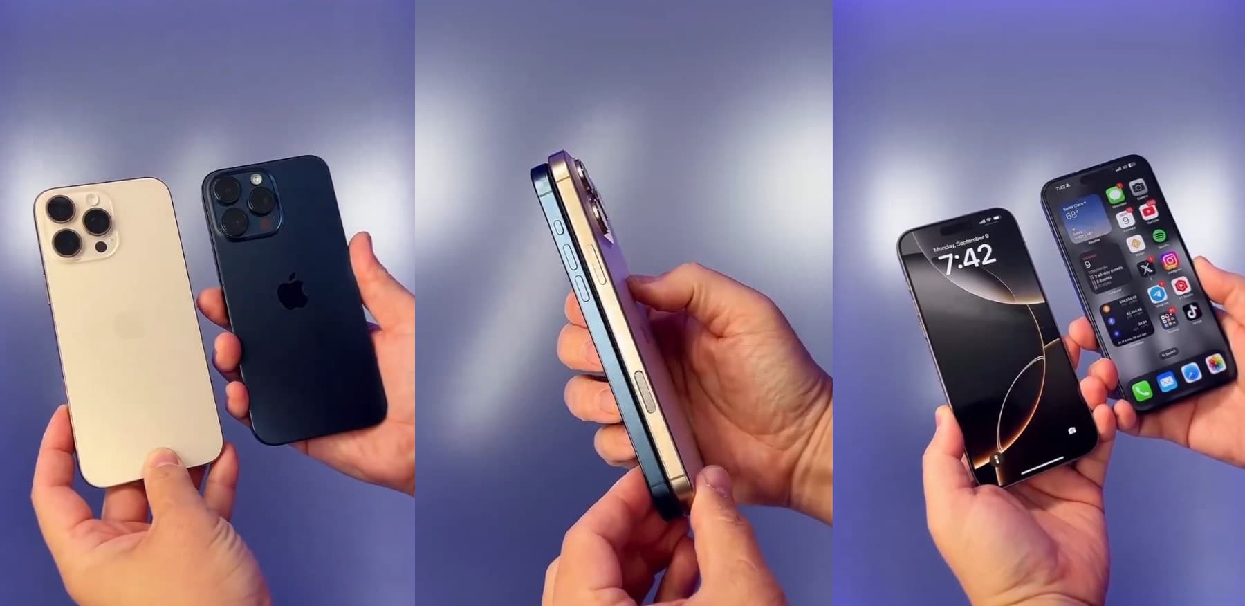 В ролике хорошо видно, что смартфоны заметно отличаются размерами. Напомним, iPhone 16 Pro получил 6,3-дюймовый 120-герцевый экран, а диагональ экрана iPhone 16 Pro Max выросла до 6,9 дюйма. У прошлого поколения экраны были 6,1 и 6,7 дюйма соответственно.