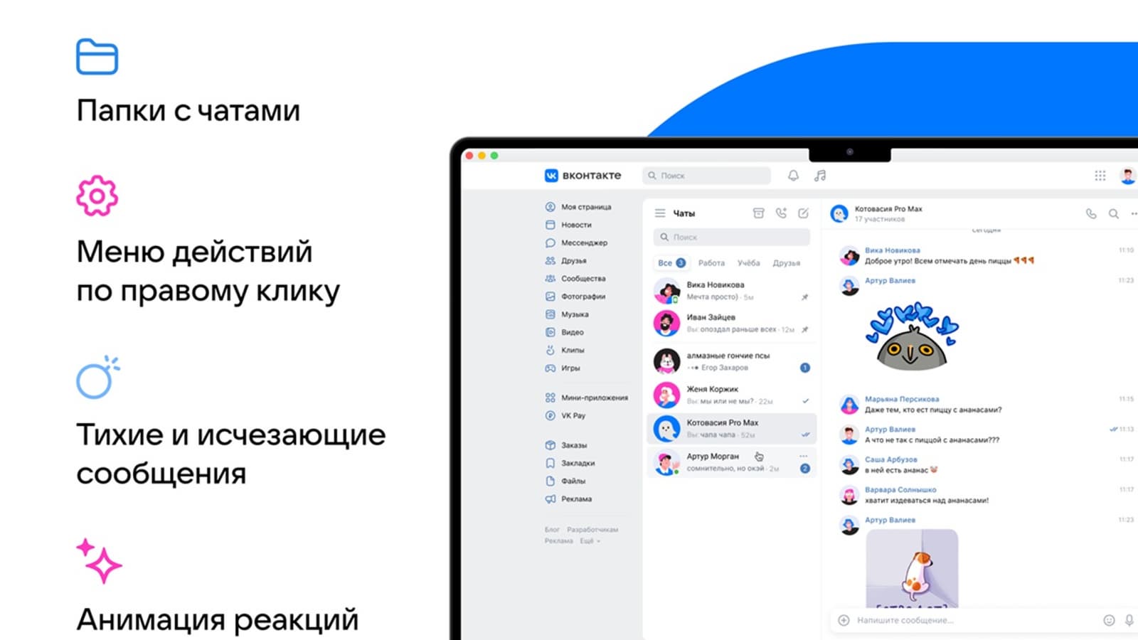 В веб-версии «VK Мессенджера» появились папки с чатами, расшифровка видеосообщений, меню действий по правому клику и анимация реакций. Также теперь есть возможность отправлять тихие сообщения, которые приходят беззвучно, и исчезающие сообщения с таймером автоматического удаления. Список чатов можно свернуть, оставив больше пространства для переписки. Кроме того, для чатов можно устанавливать тематическое и цветовое оформление.